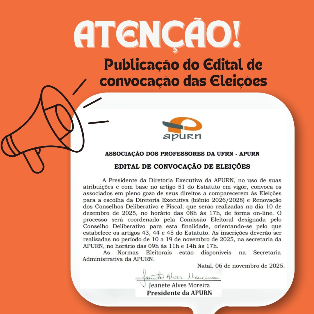 Estamos enviando o Edital de Convocação das Eleições para a Diretoria Executiva e renovação dos Conselhos (Deliberativo e Fiscal) da APURN para o biênio 2026/2028, que foi publicado no jornal Agora RN na edição do dia 06 de novembro de 2025.
